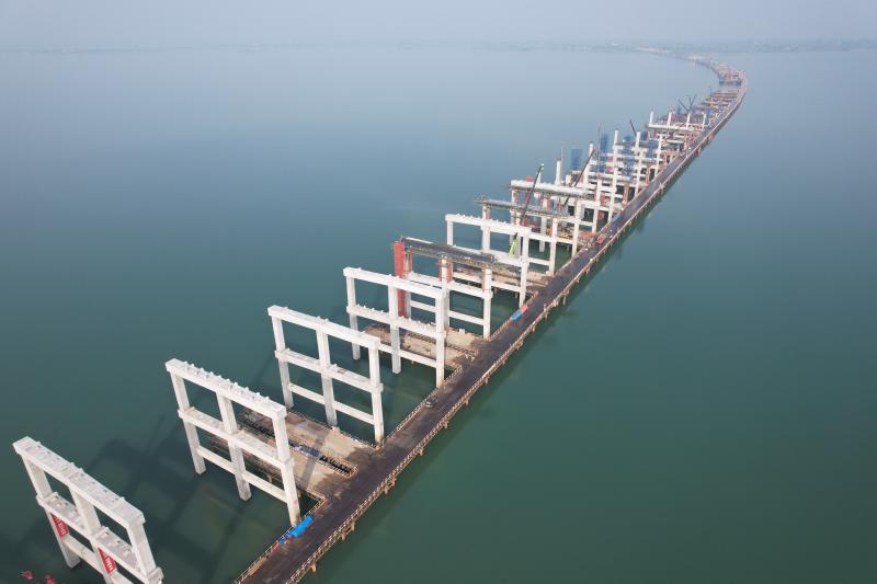 多点发力,施工进度“跑起来”。S20长固高速是区域交通网络的重要组成部分,城东湖双层桥作为全线控制性工程之一,施工难度大、技术要求高。当前,施工作业全面铺开,路基、桥梁上下部结构及桥面附属工程等多道工序同步推进。建设者们抢抓当前施工“黄金期”,日投入机械设备100多台、施工作业人员700余名,全力保障工程高效推进。“我们采取‘日调度、周盘点、月总结’机制,科学组织施工计划,优化资源配置,确保各作业面无缝衔接。”项目现场负责人介绍,目前桥梁墩柱、盖梁等下部结构施工已进入高潮,上部结构预制梁板安装和桥面系施工也在紧锣密鼓推进中。沿湖岸线之上,一座双层桥的雄姿正一天天变得清晰可见。从空中俯瞰,整片工地如同一台精密运转的机器:混凝土泵车长臂挥舞,钢筋焊接加工弧光闪烁,运输车辆来回穿梭……多作业面同步发力,工程“成势”效应日益凸显,一条贯通区域的高速通道正加快从规划变为现实。